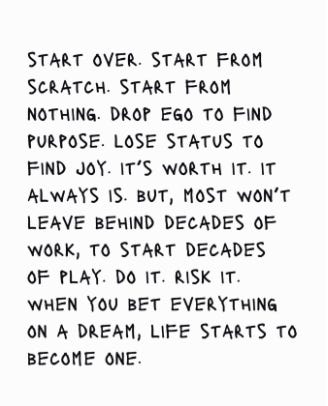 “Ricomincia. Inizi da zero. Inizia dal nulla. Abbandona l’ego e tutto ciò che pensi di sapere di te stesso, della tua vita, e trova uno scopo. Allontanati dalle abitudini per trovare la gioia. Ne vale la pena. Sempre. La maggior parte delle persone non lascerà alle spalle decenni di lavoro per iniziare decenni di gioco. Per iniziare a fare ciò che lo fa stare davvero bene. Fallo. Rischia. Quando si scommette tutto su un sogno, la vita comincia a diventare quel sogno.”